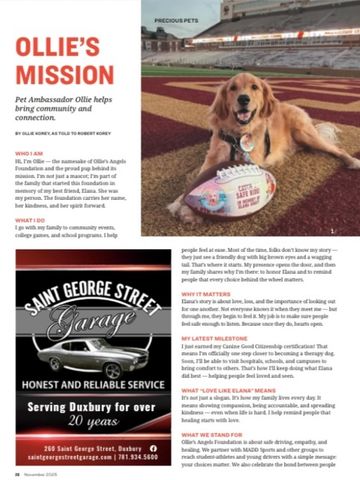 Elana Korey's golden retriever - "Ollie" is the proud pup behind its mission to help others. Ollie is a comfort therapy dog supporting those in need carrying on Elana's love, compassion, and light. Thank you to the Greet Duxbury Magazine for showcasing Ollie's love.